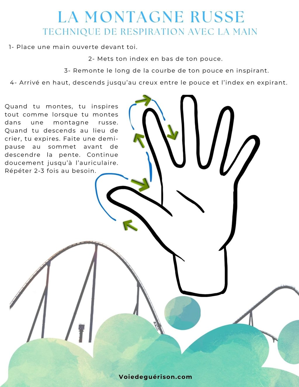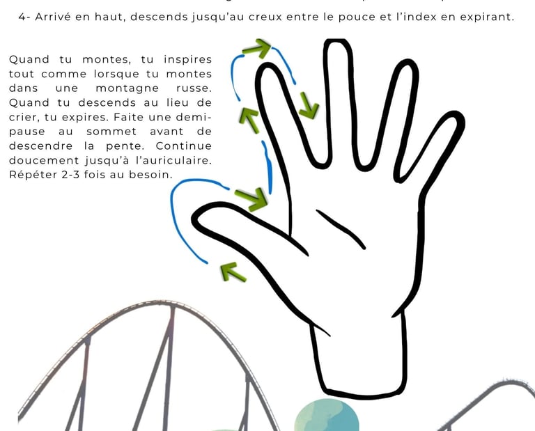 La gestion du stress et de l'anxiété est une préoccupation majeure dans le monde contemporain. Elle touche des individus de tous âges. Parmi les techniques éprouvées, on retrouve la respiration contrôlée. La technique de respiration utilisant la main se distingue par sa simplicité et son efficacité. Cependant, j’ai cru bon d’apporter une adaptation originale dans le nom de cette méthode, surnommée la "La Montagne Russe" (ou "Roller Coaster" en anglais). Bien que le nom puisse initialement sembler paradoxal, compte tenu de la nature stimulante d'une véritable montagne russe, cette analogie recèle des avantages instructifs qui facilitent l'apprentissage et l'acceptation de l'exercice de calme.